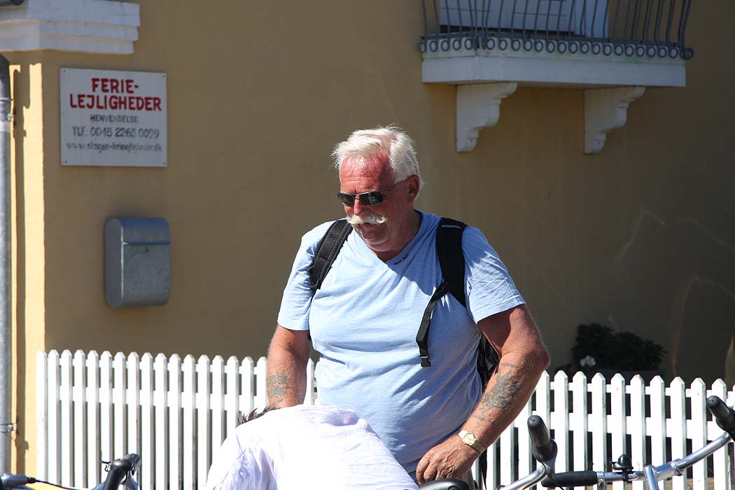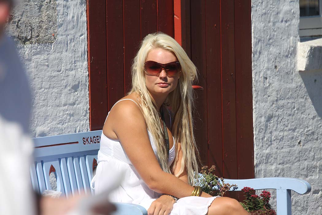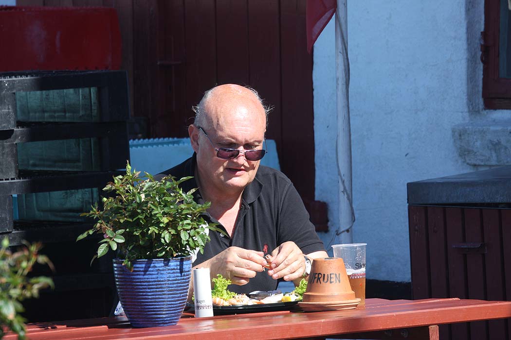 | Havnen i Skagen. Manden har fået serveret en portion rejer. | |||