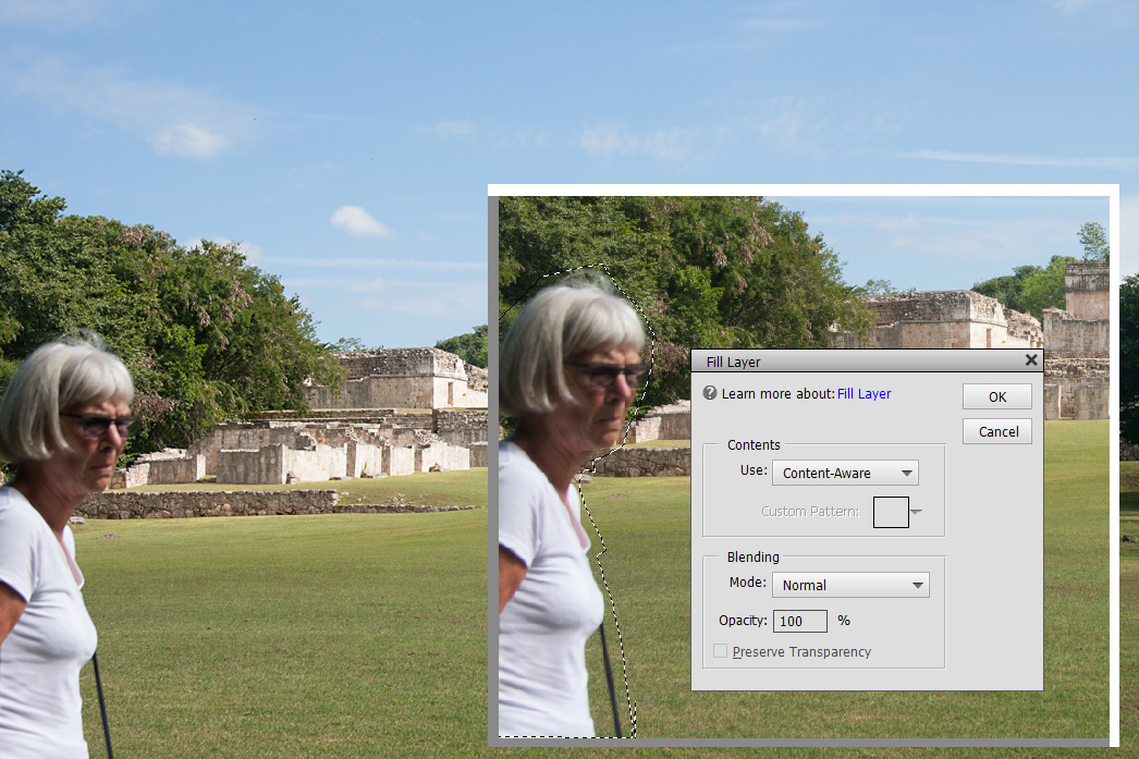 Kvinden skulle ikke have været med på billedet. Sådan kan det gå, når man er mere optaget af motivet, end det man ser i søgeren. Problemet kunne man have løst med beskæring og kloning. Her er valgt en anden løsning til at fjerne hende, nemlig: Content-Aware. PS: I virkeligheden tog jeg et andet billede, da min medrejsende havde passeret.