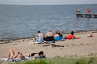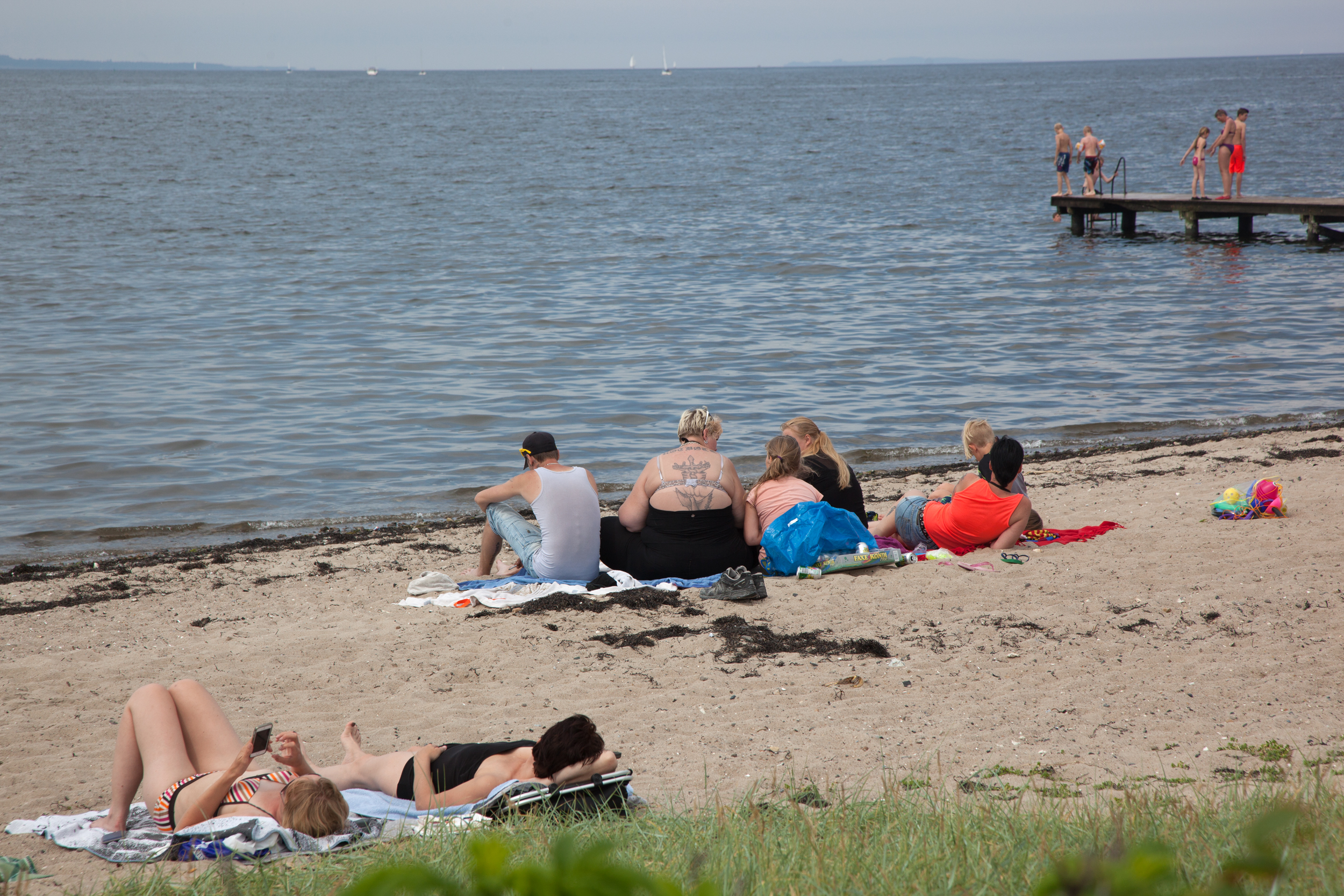 Beskær foto og fjern de to lygtepæle. Den høje lygtepæl fjerne jeg i flere omgange - små stykke ad gangen med Contense-Aware. Tæt på kvindens arm og hånd kan der bruges Clone Stamp Tool (stempel) og /eller Spot Healing Tool (hæfteplaster).