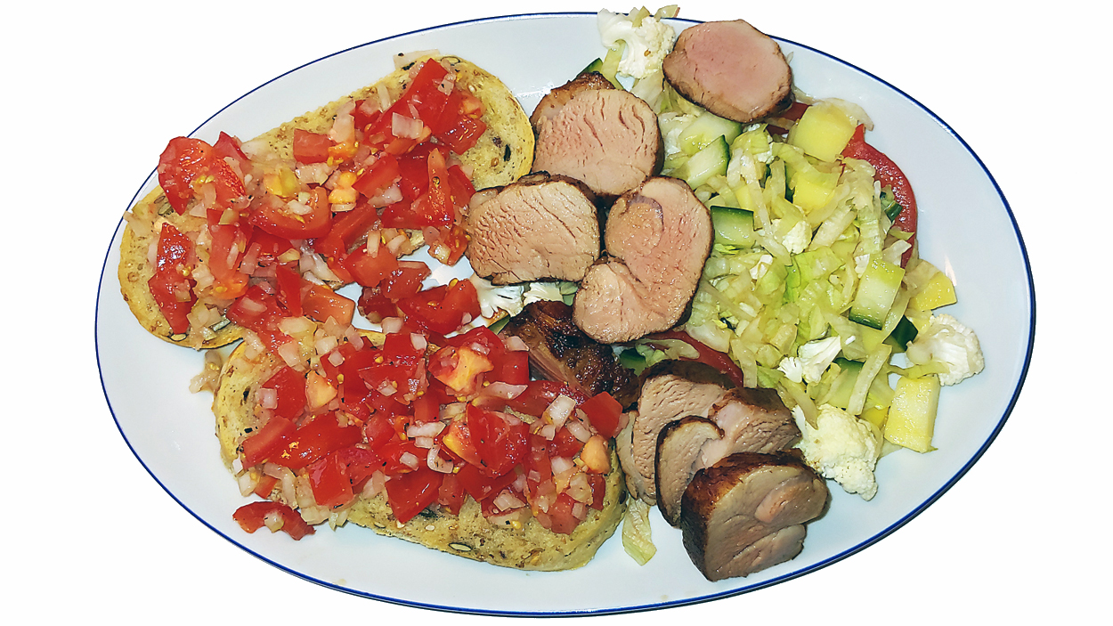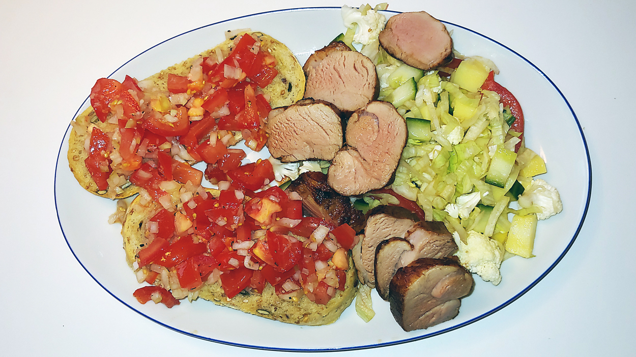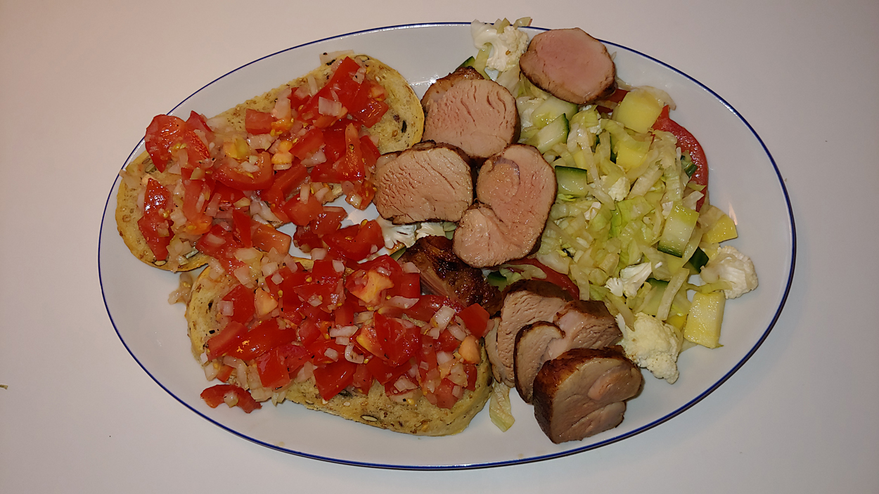 Svinemørbrad med bruschetta. Foto er taget med mobilen. PS: Fadet er ovalt - der er altså ikke tale om en fortegning.