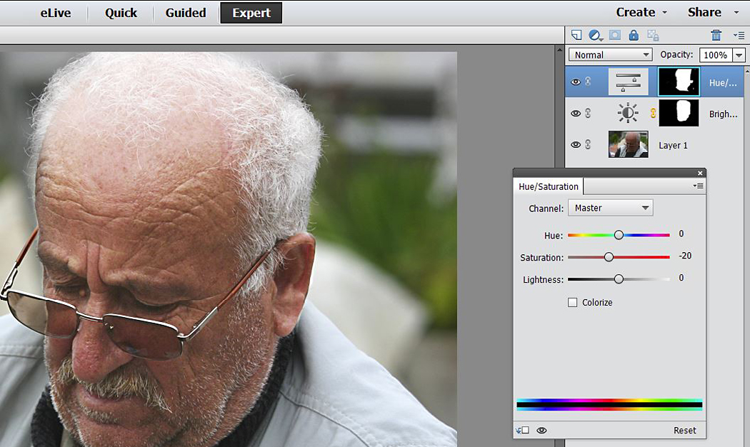 Hue/Saturation. Træk lidt ned i Saturation. Vælg blød, sort