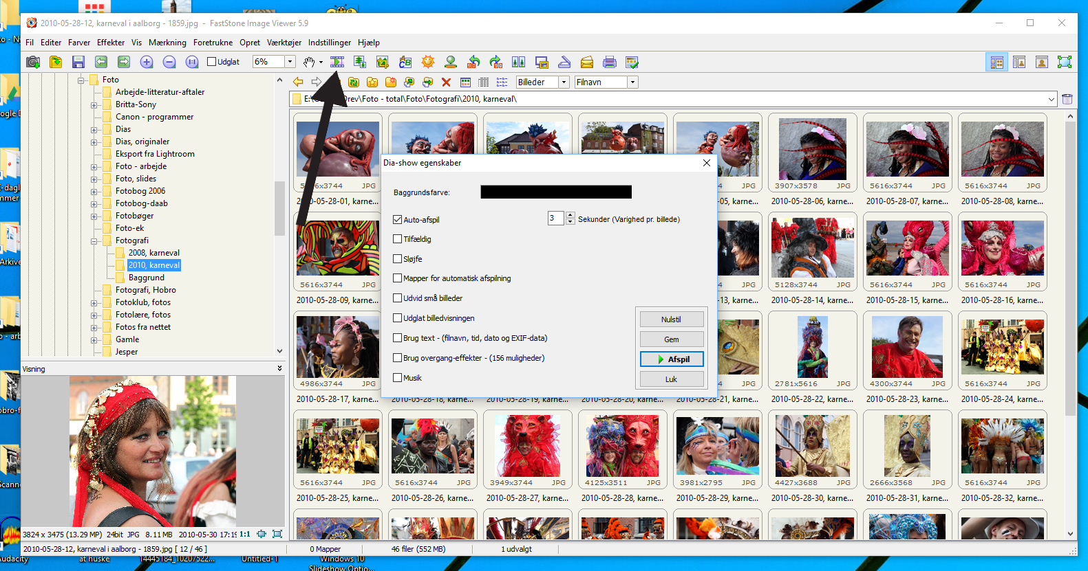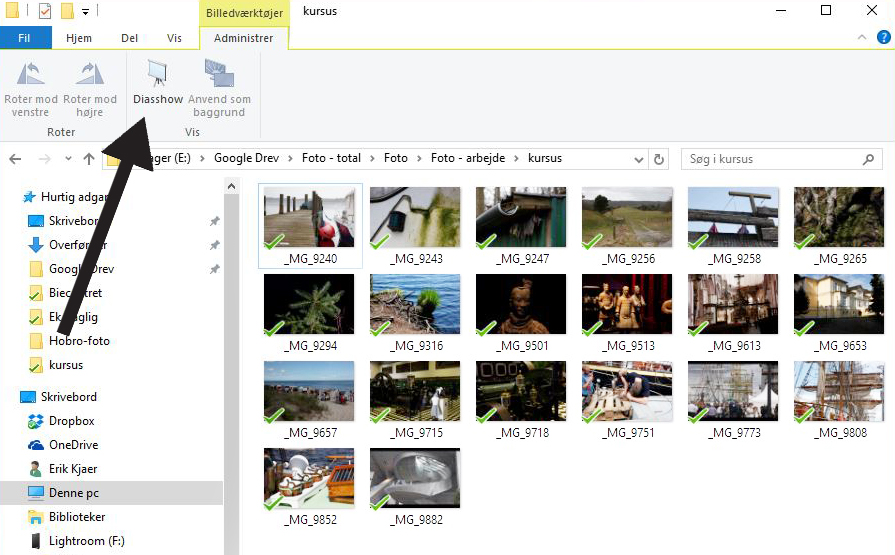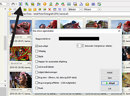 Åbn en mappe. Vælg Administrer - Diasshow. Når show'et kører, kan der ændres på hastigheden ved at højreklikke. Så kan der vælges mellem tre hastigheder.