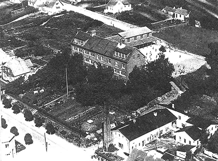 Nordre Skole set fra luften. Skolehaven, som vi kalder den i dag, var den gang urtehave.