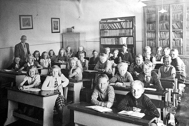 Tilbage til billedet: Billederne på væggen var sort/hvide reproduktioner af sikkert betydelige kunstværker. Vi så dem aldrig – de var der bare. I de små klasser var der store, trykte paptavler til anskuelsesundervisning – det var der et fag, der hed. De forestillede f. eks. arbejdet på en bondegård, hvor der blev høstet med le og bundet i neg, og lærerne forklarede og pegede og lærte os en masse, som var vældig spændende. Husk nu på, at det var før traktor og selvbinder og især før tv og video. Skolen ejede dog en smalfilmsfremviser, og jeg erindrer en sjælden gang, hvor vi i geografi så en sort/hvid film fra fremmede lande, og lyden af det snurrende apparat, men også det sjoveste: At man fik lov til at se filmen baglæns! Jeg husker ikke, at vi havde sorte rullegardiner, men det må vi have haft under krigen, for selv om der kom elendigt lys ud af klasseværelsets 6 små lamper, så skulle man jo kunne mørklægge i vintertiden. Men jeg er sikker på, at skulle der trækkes for – eller for den sags skyld åbnes et vindue – var der altid 20 frivillige, som ville gøre det. Læreren var dengang en ophøjet person, som altid kunne få hjælp af tjenstivrige elever. Eller måske gjorde de det for at få lidt afveksling i ellers en kedelig time!