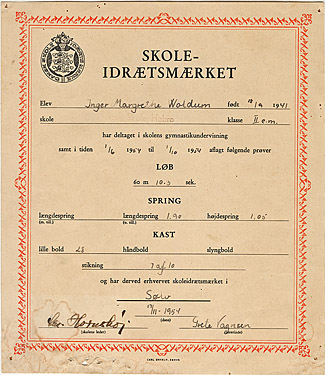 Inger Larsen-Ledet, ( Woldum) har sendt diplomer og skoleidrætsmærker. Klik på diplom for at se i stor størrelse.