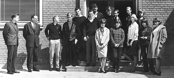 række fra venstre: Lærer Jacobsen, skoleinspektør Ebdrup, Finn Jensen,