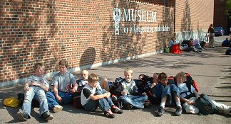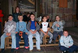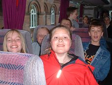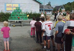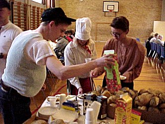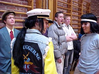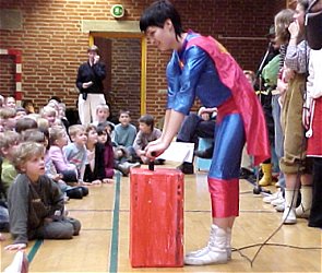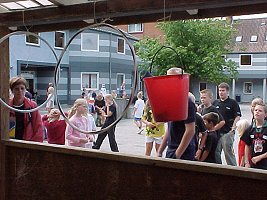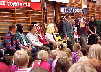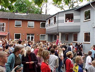 Fredag, den 23. maj 2003 startede kl. 07.00 med rundstykker i den gamle gymnastiksal. | Kl. 08.00 samledes hele skolen i den nye gymnastiksal, hvor de to 9. klasser lavede underholdning. Her er det 9.a, der tager sig Kærligt af klassens lærere. |