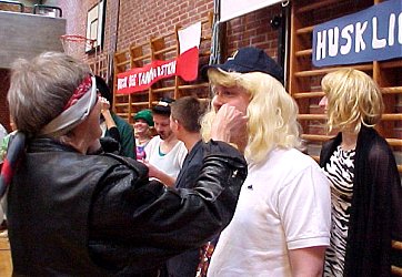 Det skortede ikke på fantasifulde kostumer | 9.b var ikke mindre ubehagelige overfor deres lærer. Her er det Else Helboe, der med bind for øjnene børste tænder på Claus Møller Jensen. |