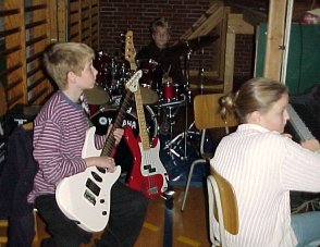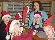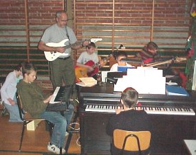 Orkesteret spiller op til generalprøven | I skolestuen under nisseloftet | ||