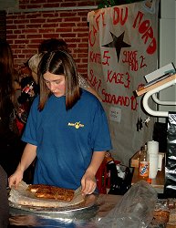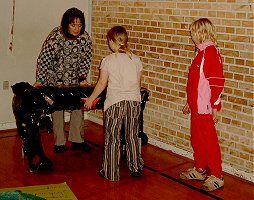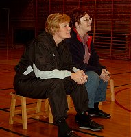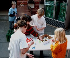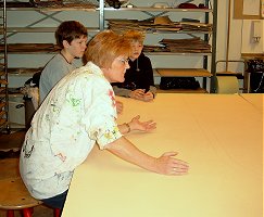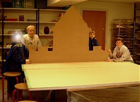 Alt skal klares i løbet af ugen, så der er travlhed. Til venstre giver Helle Jørgensen instruktion i at lave en bagvæg. | ||