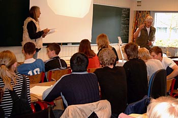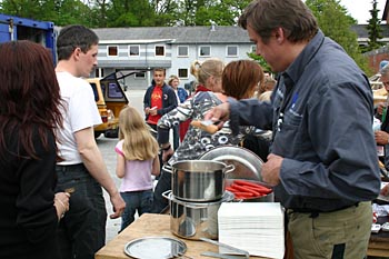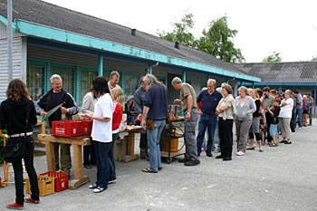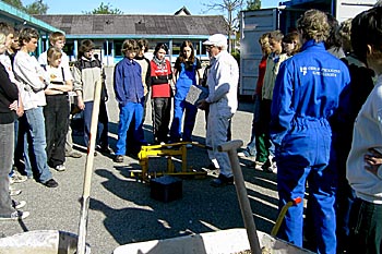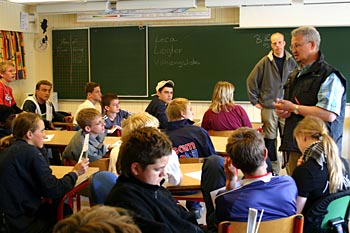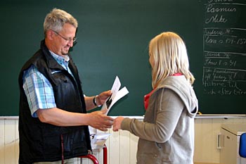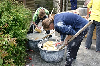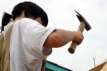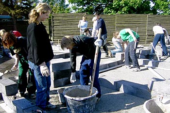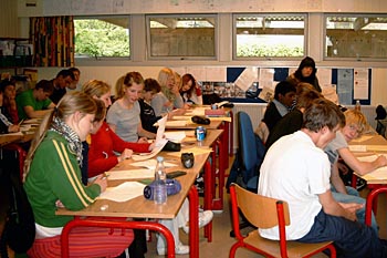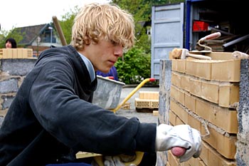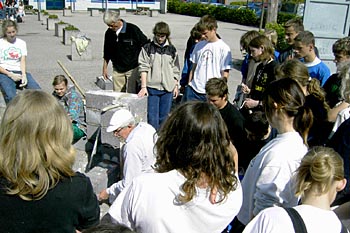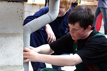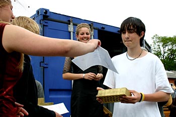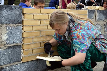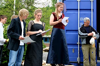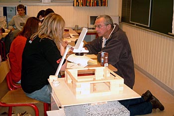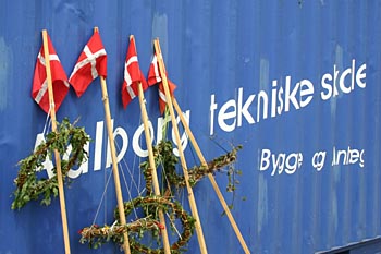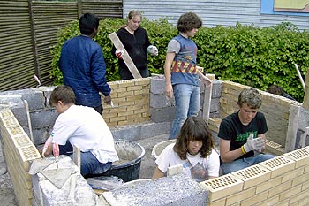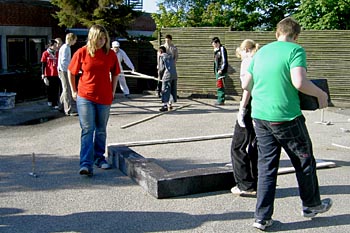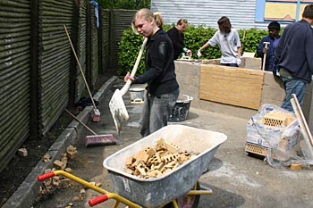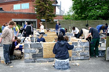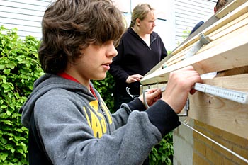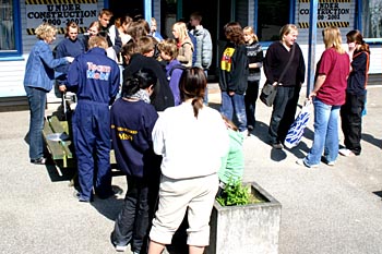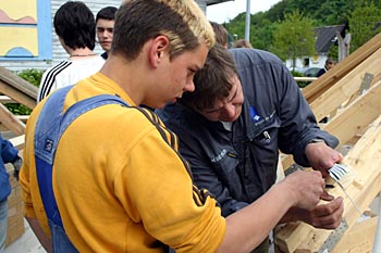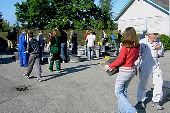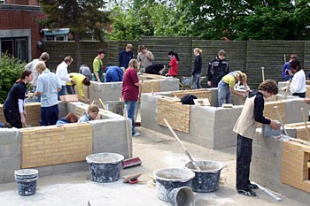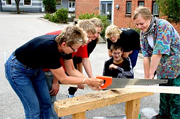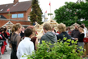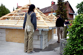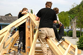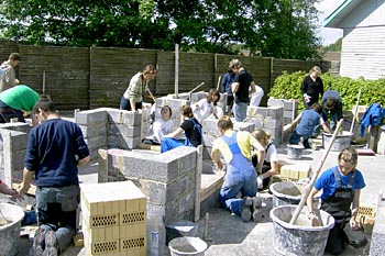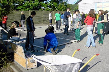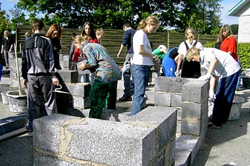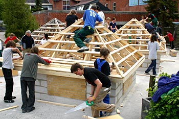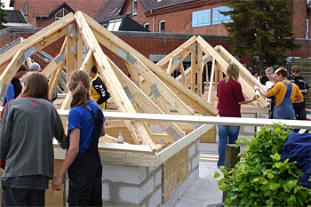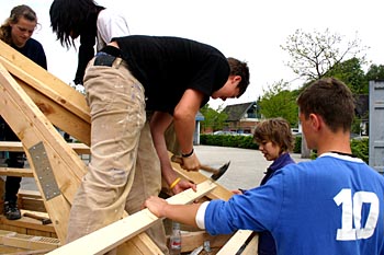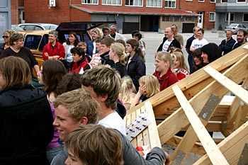 Torsdag, den 26. maj 2005 Dagen bød på tømrerarbejde. Spær blev leveret. Eleverne skulle rejse spær, lægte og lave underbeklædning, inden der kunne sættes krans på. Kl. 17.00 var der rejsegilde. Forældre mødte op. Der blev holdt taler, som det sig hør og bør. Og så var der pølser! |