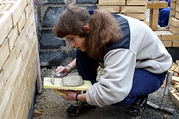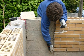 Først blev der bygget hjørner i Leca-blokke. Derefter kom turen til mellempartierne. Disse mures med mursten - såvel facademur som bagmur.