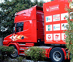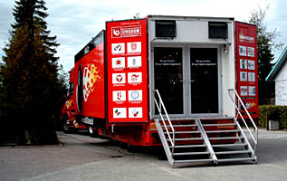 stillede op i skolegården. Formålet var at orientere elever i 8. og 9. klasse om håndværksuddannelserne. Lastbilen fik mange beundrende blikke. |