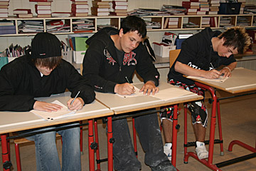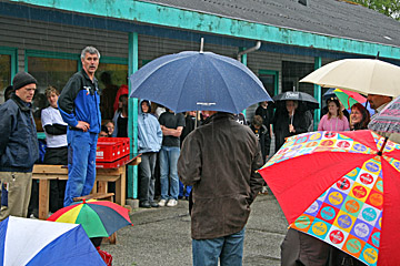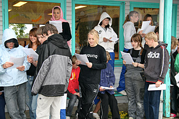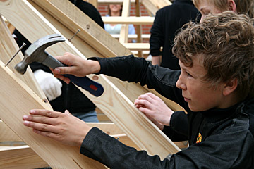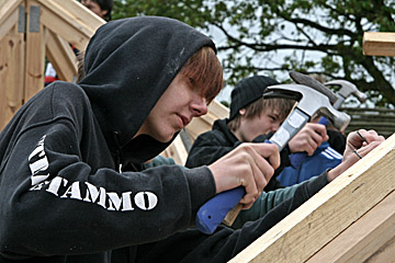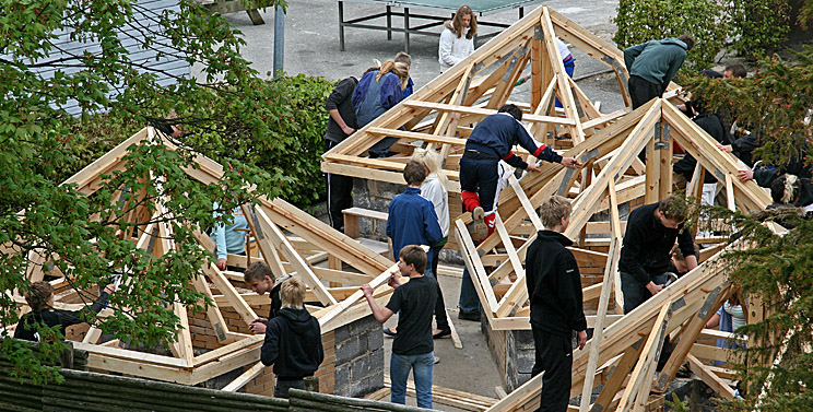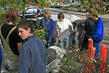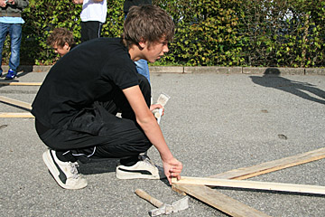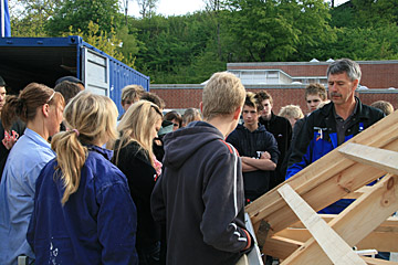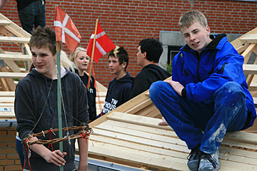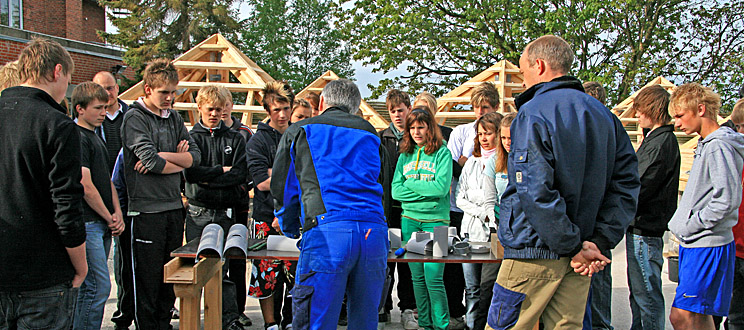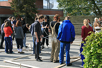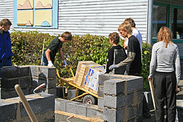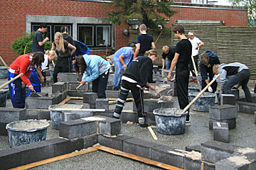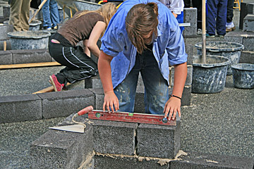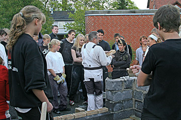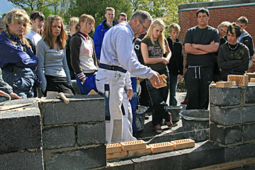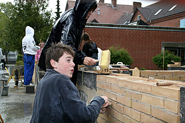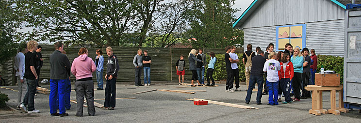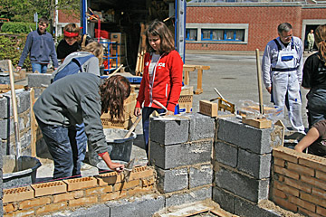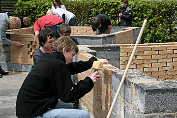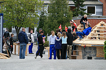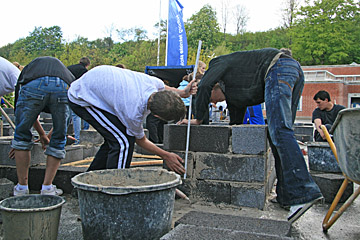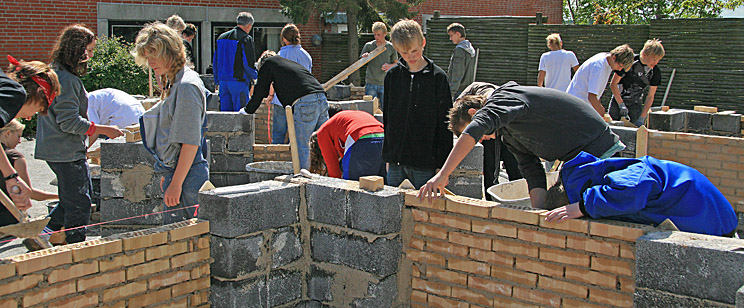 Mandag, den 7. maj 2007 Traditionen tro får 8. klasse lejlighed til at prøve kræfter med byggefag under kyndig ledelse af Teknisk Skole, Aalborg, der møder op med såvel lærere, værktøj og materialer. Bremer Pedersen (blikkenslager) introducerede eleverne til de 4 dage, og på pladsen var det i høj grad Henning Hornstrup (murer), der tog over. |