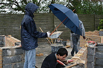 Tirsdag, den 8. maj 2007 Det blev en dag med regnbyger, og noget arbejde måtte opgives. Det var ikke muligt at pudse hjørnerne, og det var besværligt at fuge. Altså måtte disse opgave udgå af dagens program. |