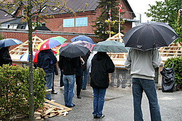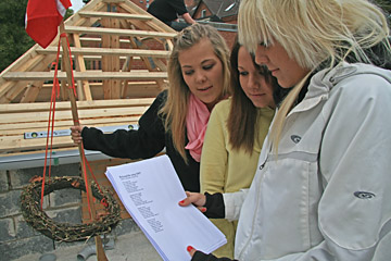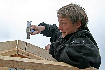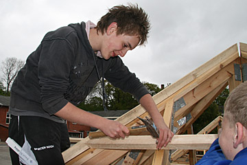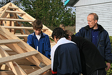 Onsdag, den 9. maj, 2007 Vejret var skikkeligt, og der blev sat spær og lægtet. Det er ikke så let endda at få lægterne savet til med det rette smig.