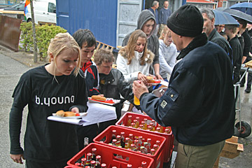 Den til lejligheden forfattede sang synges, | og så var der pølser to sodavand til alle. |