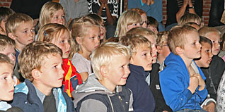 Den store finale på naturvidenskabsdagene var et stort kemishow iværksat af to af vores fysiklærere på skolen, Ann og Svend. Børnene var fuldstændig opslugte af ”Den store fødselsdag”, som Ann og Svend havde bygget deres show op over. De lavede en masse forsøg, som alt sammen skulle bruges for at lave den helt perfekte fødselsdag. Bl.a. lavede de flag ved hjælp af en spray, tre farvede drinks, flotte farver, flamingospisende napalm, lyseslukker på lang afstand, trylledrik der ændrede farve når den blev rystet og mange flere spændende ting. Den bedste afslutning på to helt anderledes dage i naturvidenskabens tegn. |